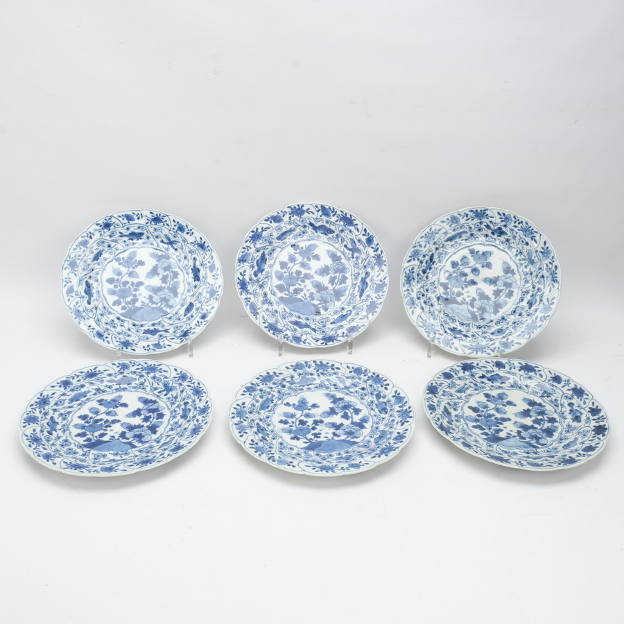 Lot van zes antieke vroeg 18e eeuwse Chinees porseleinen borden, Kangxi periode, met decor van vissen, garnalen en bloemen
