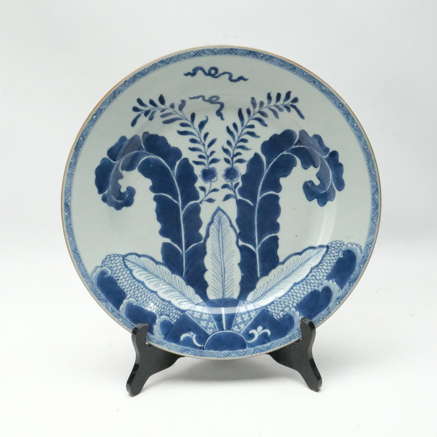 Een 18e eeuws Chinees porseleinen bord met onderglazuur blauw decoratie van tabaksbladeren. Qianlong of Yongzheng periode
