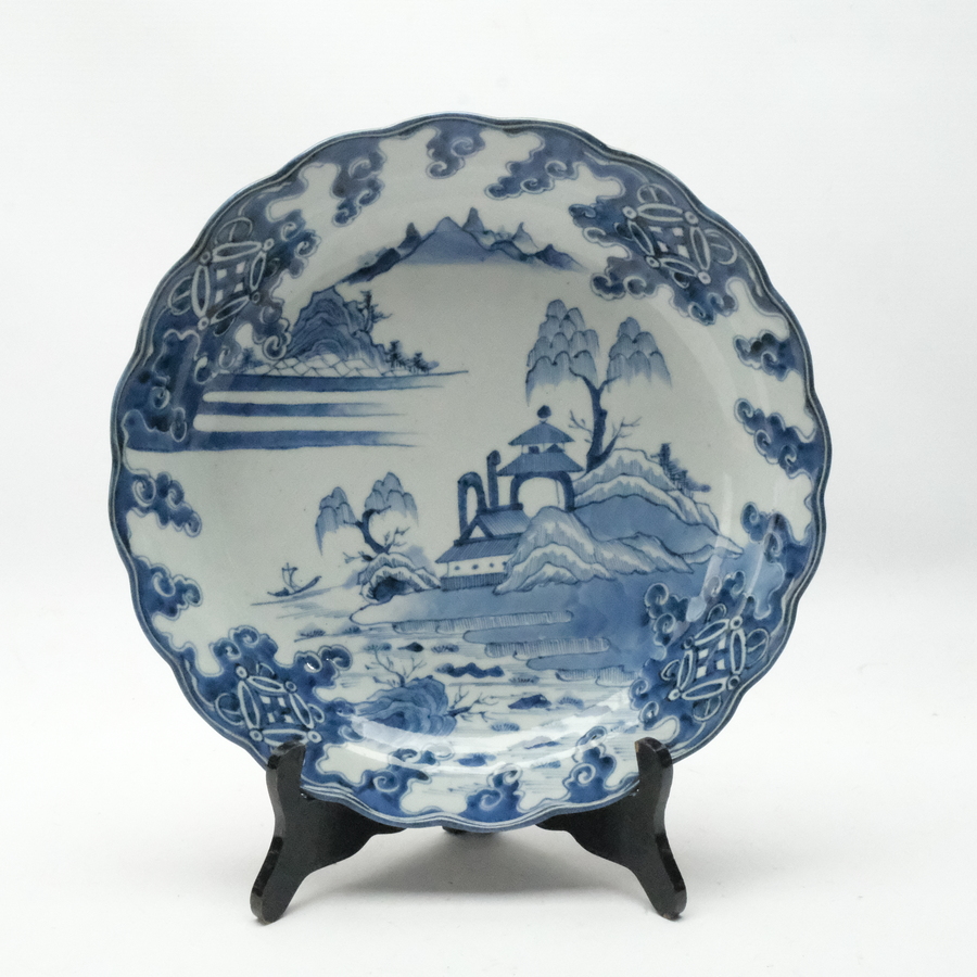 Een 18e eeuws Japans porseleinen bord/schaal met decor van een tempel en wilgen.