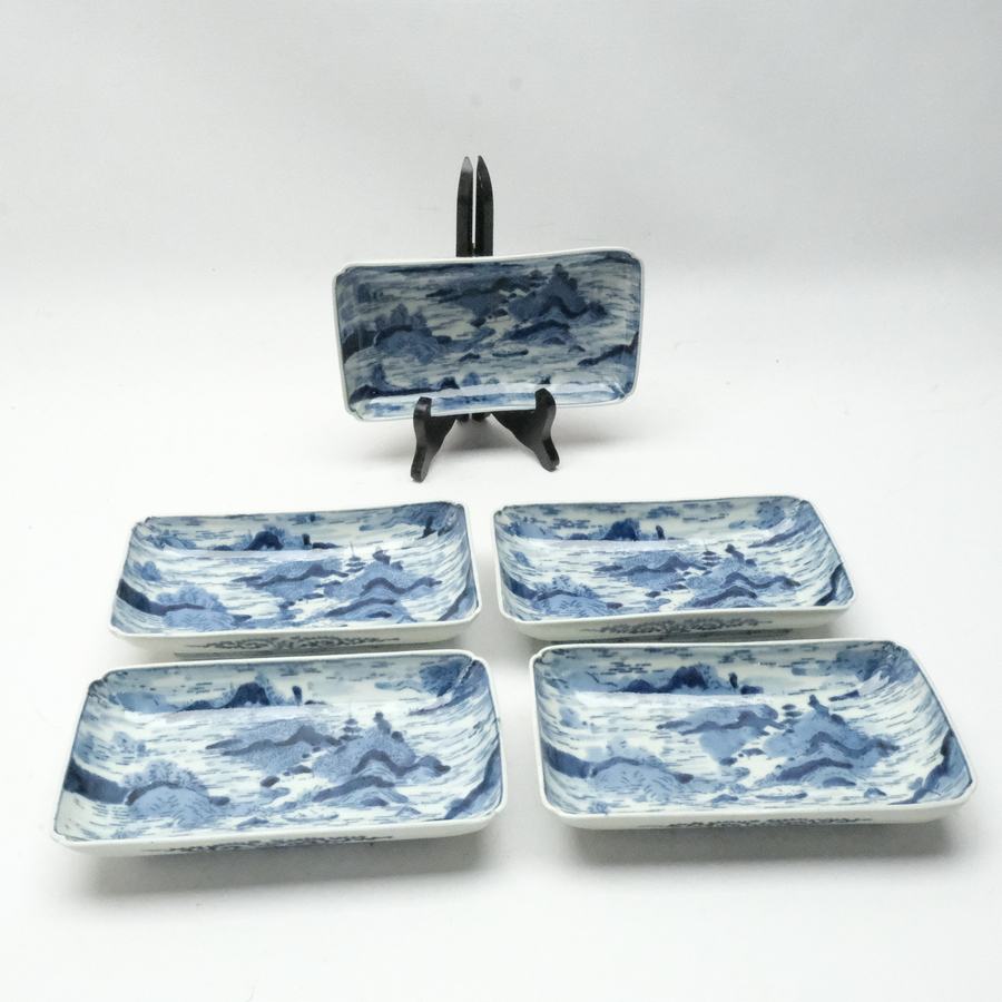 Lot van vijf 18e eeuwse langwerpige Japanse schaaltjes, gemerkt met vierkaraktermerk. Zie voor soortgelijk collectie V&A