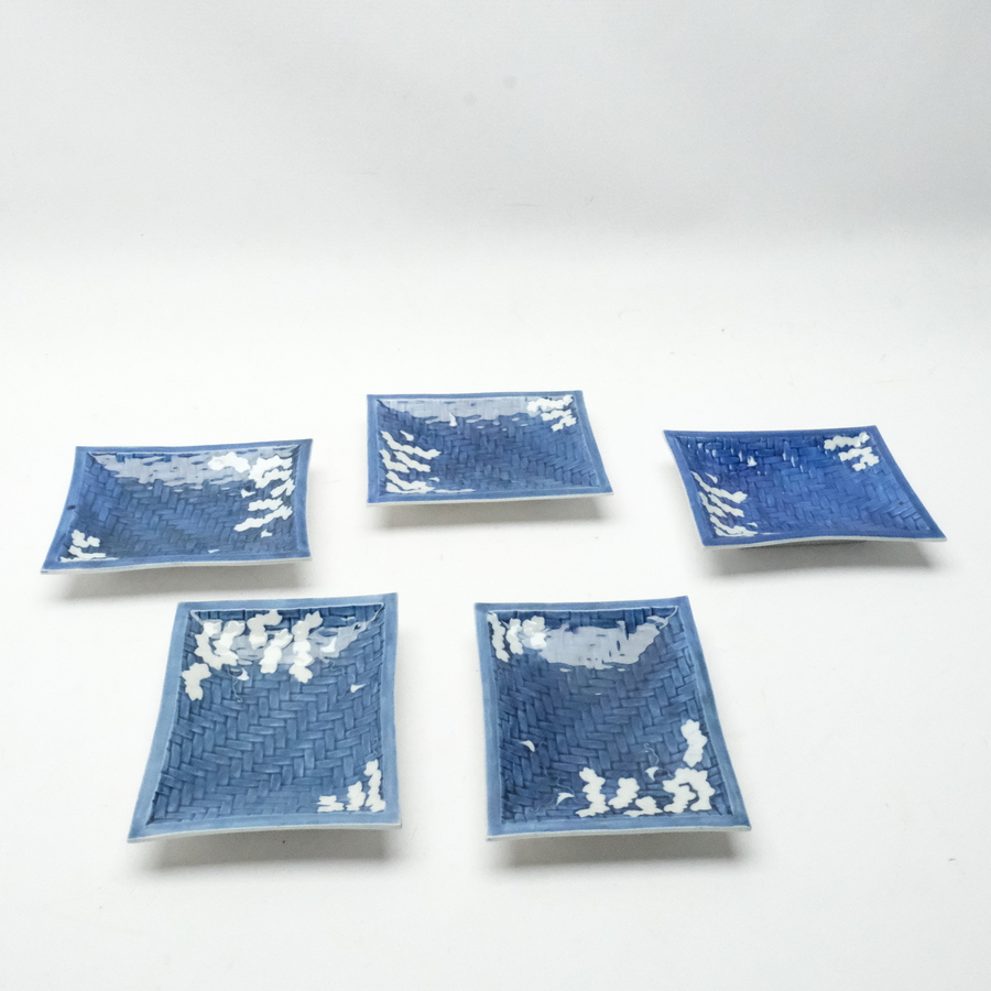 Lot van vijf 19e eeuwse Japanse schaaltjes met gevlochten decor en in het wit afbeelding van wolken