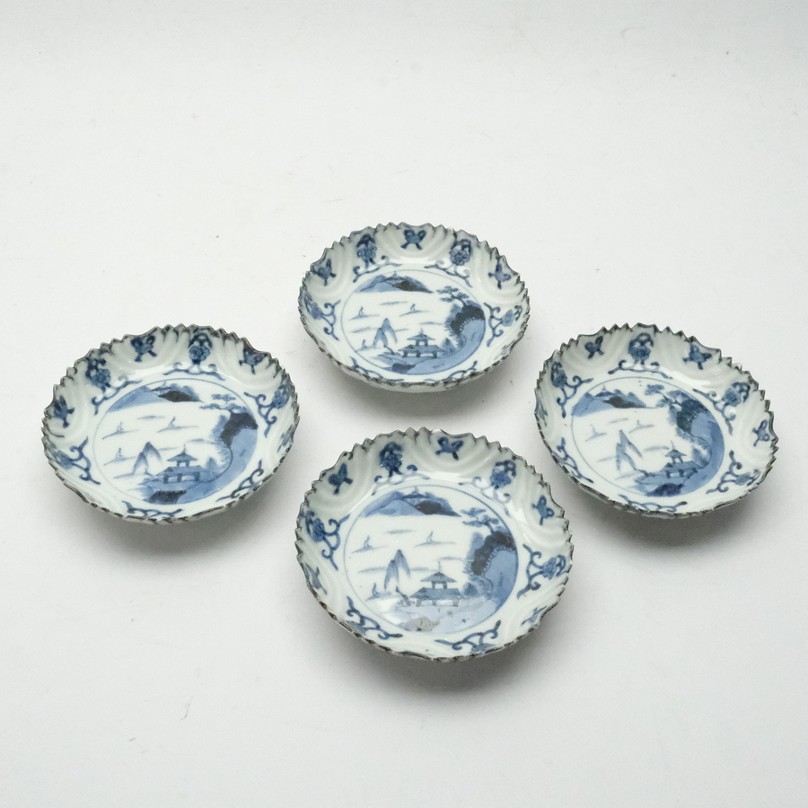 Lot van vier 18e eeuwse Japanse schaaltjes met reliefdecor, gecontourneerde rand en tempel op rots
