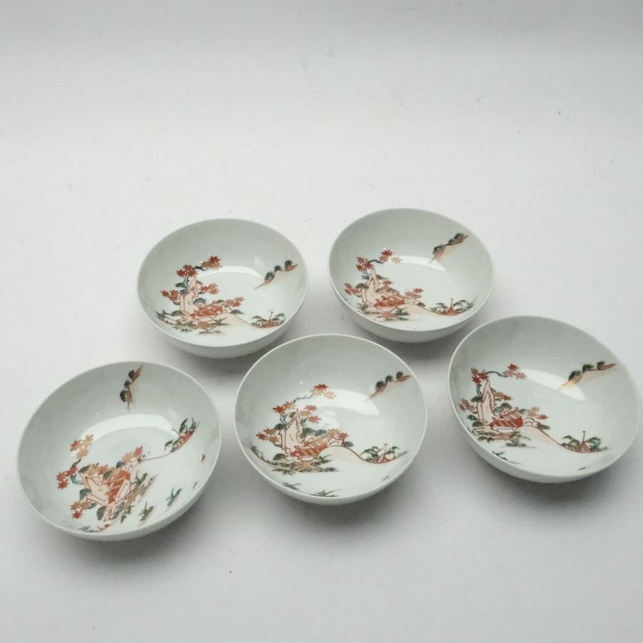 Lot van vijf 18e eeuwse Japans porseleinen kommen met overglazuur decoratie in groen, rood en blauw