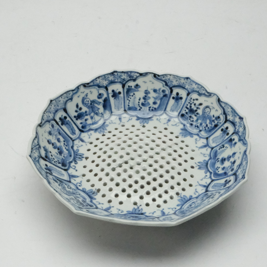Een 18e eeuwse Japans porseleinen vergiet, kopie naar Delfts aardewerk. Zie boek ‘Fine and curious’ van Jörg voor hetzelfde patroon