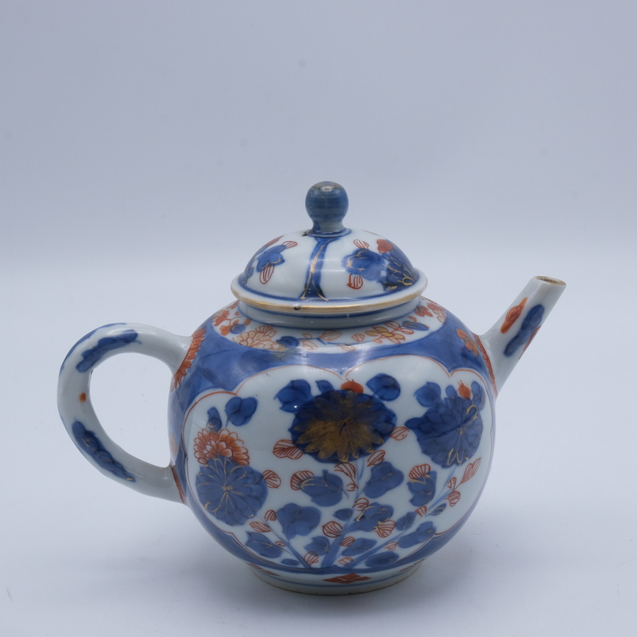 Een antieke vroeg 18e eeuwse porseleinen theepot, floraal imari decor. China, Kangxi periode (1661 - 1722)