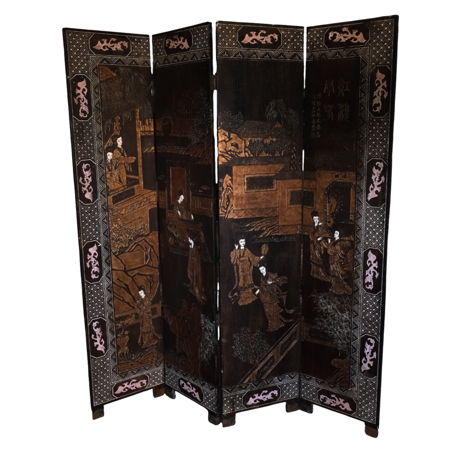 Een laat 19e eeuws Chinees houten vierdelig kamerscherm met decor van lijzen bij pagodes, Guanxu periode