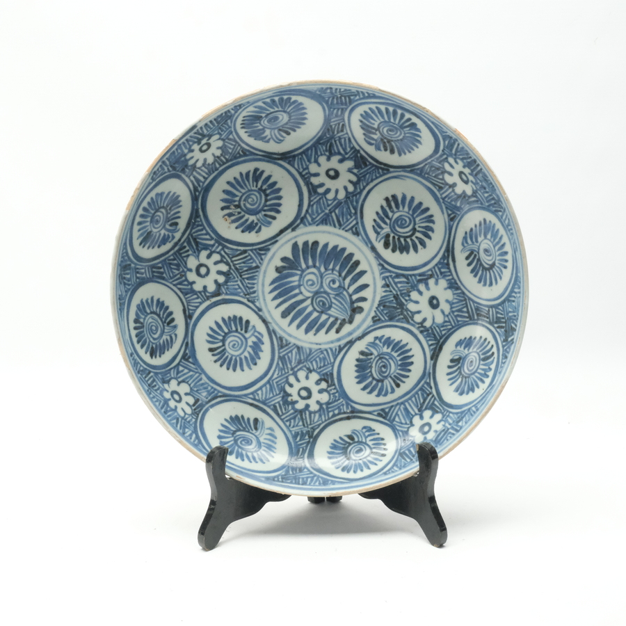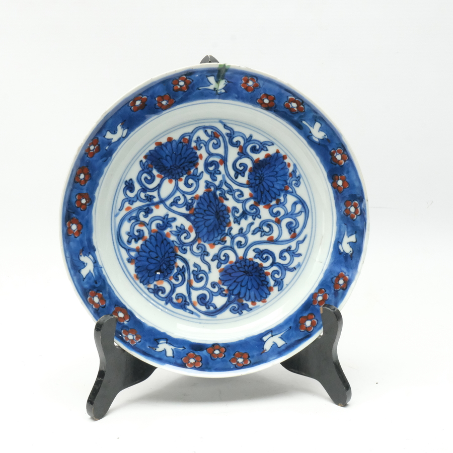 Een 17e eeuws Chinees porseleinen bord voor de Japanse markt, met originele reparatie. Six character mark Chenghua