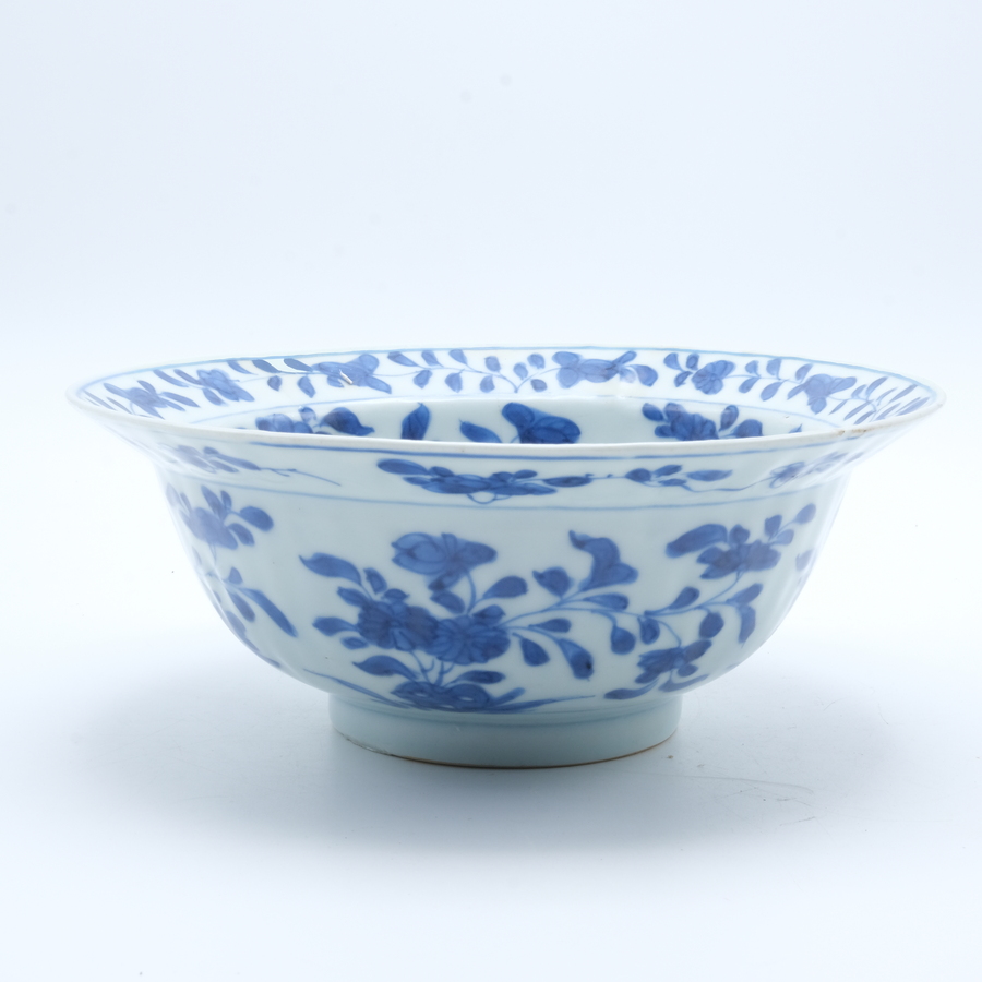 Een vroeg 18e eeuwse Chinees porsleinen klapmuts kom. Blauw-wit met een floraal decor rondom. Kangxi periode.