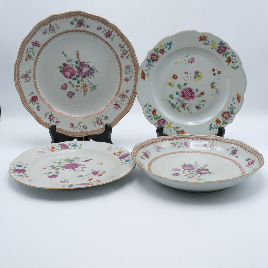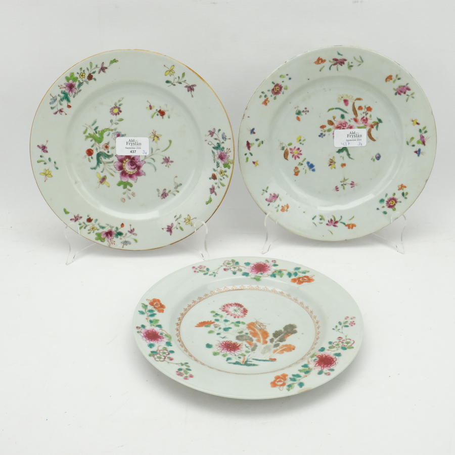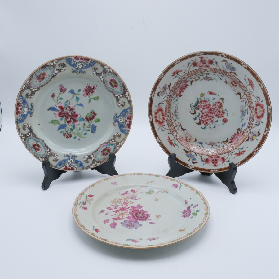 Drie diverse 18e eeuwse Chinees porseleinen Famille rose schotels. Florale motieven op de randen en het plat.