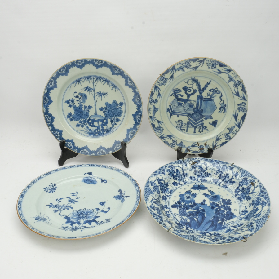 Vier Chinees porseleinen schotels. Blauw wit met diverse florale decors en een krekel. Qianlong en Kanxi periode.