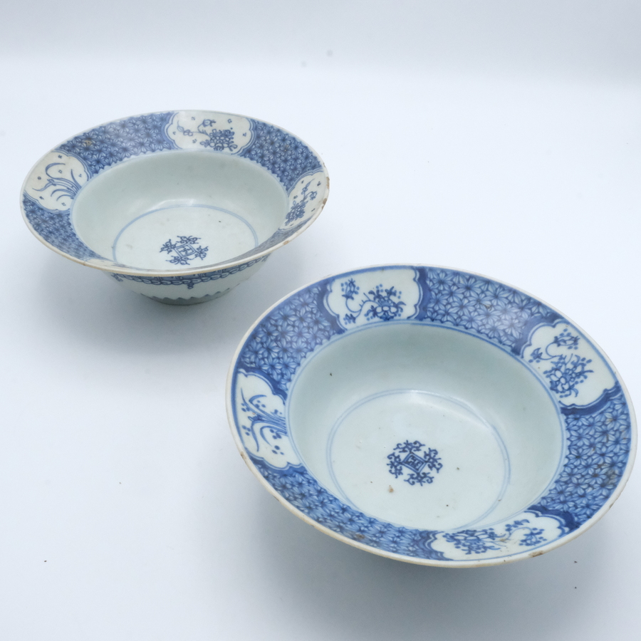 Twee Chinees 18e eeuwse porseleinen klapmutskommen. Blauw/wit met florale decors in cartouches.