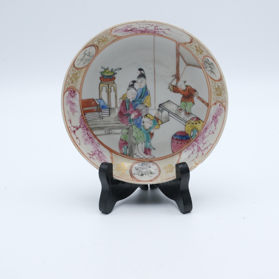 Een 18e eeuwse Chinees porseleinen schoteltje. Polychroom detailistisch en fijn beschilderd met een interieur met lijzen en zotjes