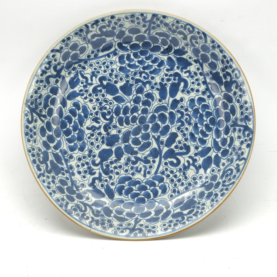 Een vroeg 18e eeuwse Chinees porsleinen schotel. Blauw/wit volgeschilderd met bessen en pioenrozen. Kangxi periode.