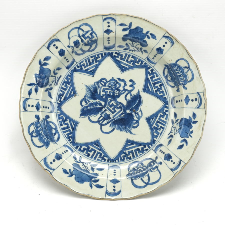 Een laat 17e eeuwse Chinees porseleinen schotel. Blauw/wit met vlakverdelingen op de rand en een kostbaar heden en symbolen in stervorm op het plat. Kangxi periode