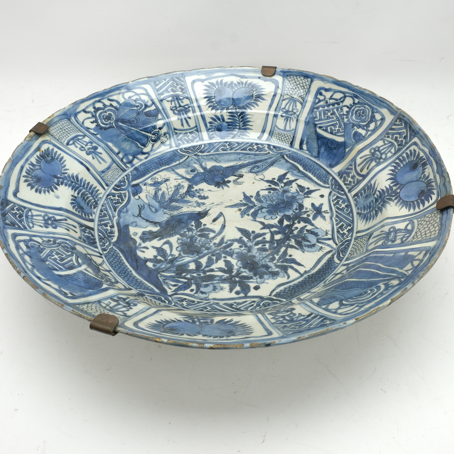 Een kapitale Chinees Kraak porseleinen schotel. Blauw/wit met vakverdeling op het randen en met vogels/kraaien op de rotsen tussen de bloemen op het plat.
