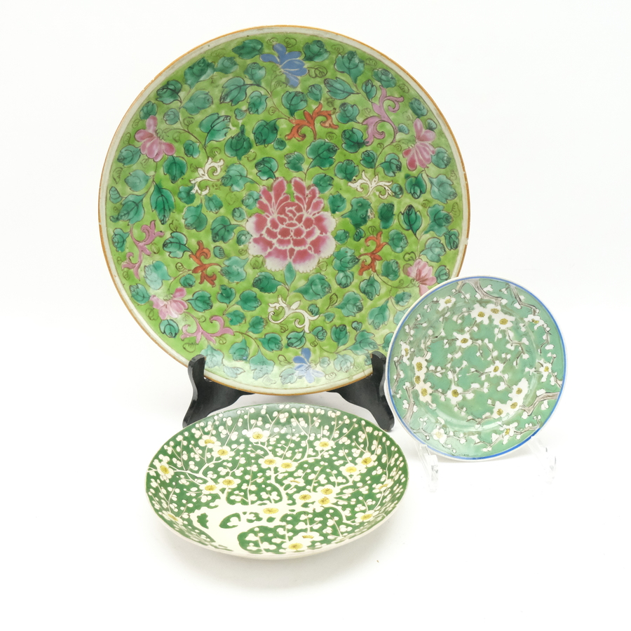 Drie 18e eeuwse famille verte Chinees porseleinen schotels. Diverse florale randen en decors van pioenrozen op het plat.