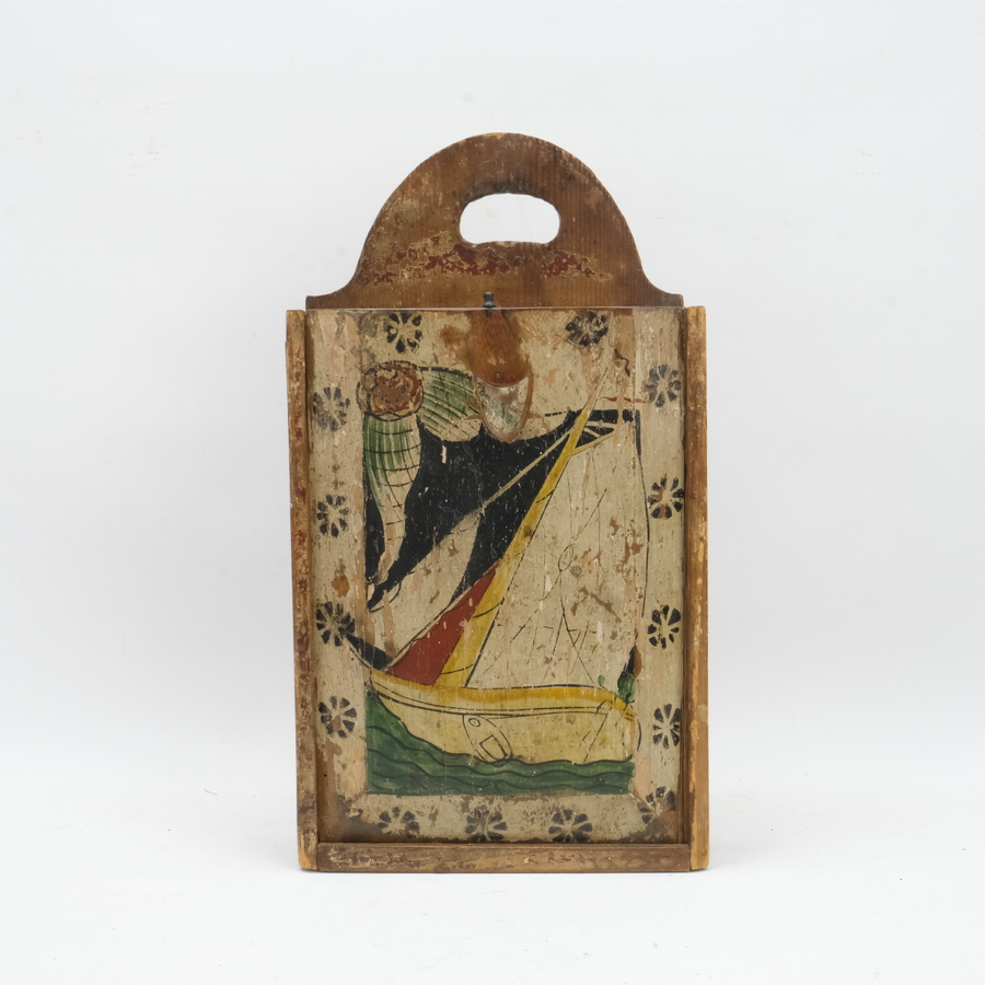 Een antieke 19e eeuwse Jouster schooltas met polychrome beschildering van een zeilschip.