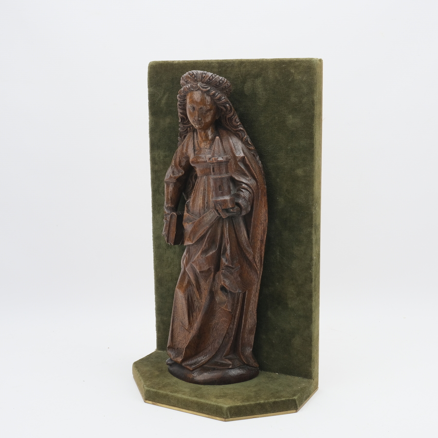 Een 17e eeuws eikenhouten sculptuur, voorstelling van St. Barbara, op fluwelen basement.
