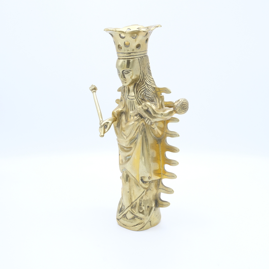 Een antiek bronzen sculptuur, voorstelling van een gekroonde Maria op de maansikkel, omgeven door een vlammende mandorla, met in haar armen Christus. Het beeldje vormde de bekroning van een kaar...