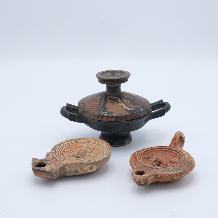 Een antieke Grieks aardewerken Lekanis, 4e/3e eeuw voor Chr. Dekselschaatje op voet met grote knop en twee oren. Op de deksel decor van twee figuren. Met daarbij twee olielampjes, mogelijk Rome...