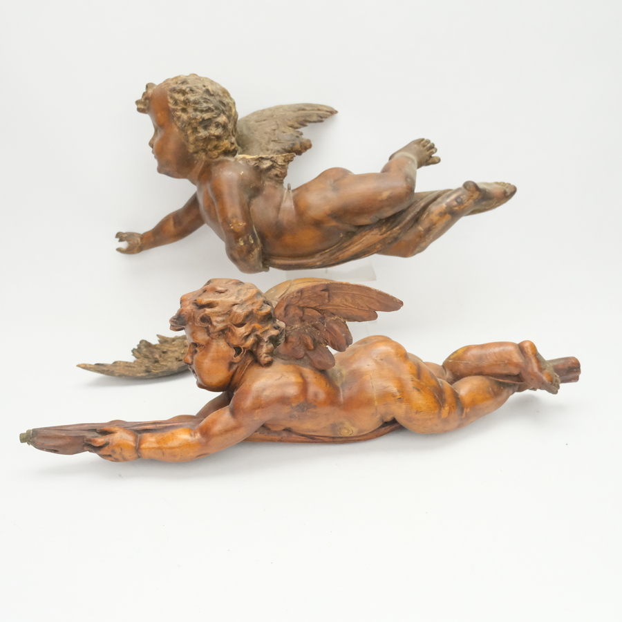 Twee antieke uit vruchtenhout gestoken sculpturen van putti of engelen. 19e eeuws of ouder.