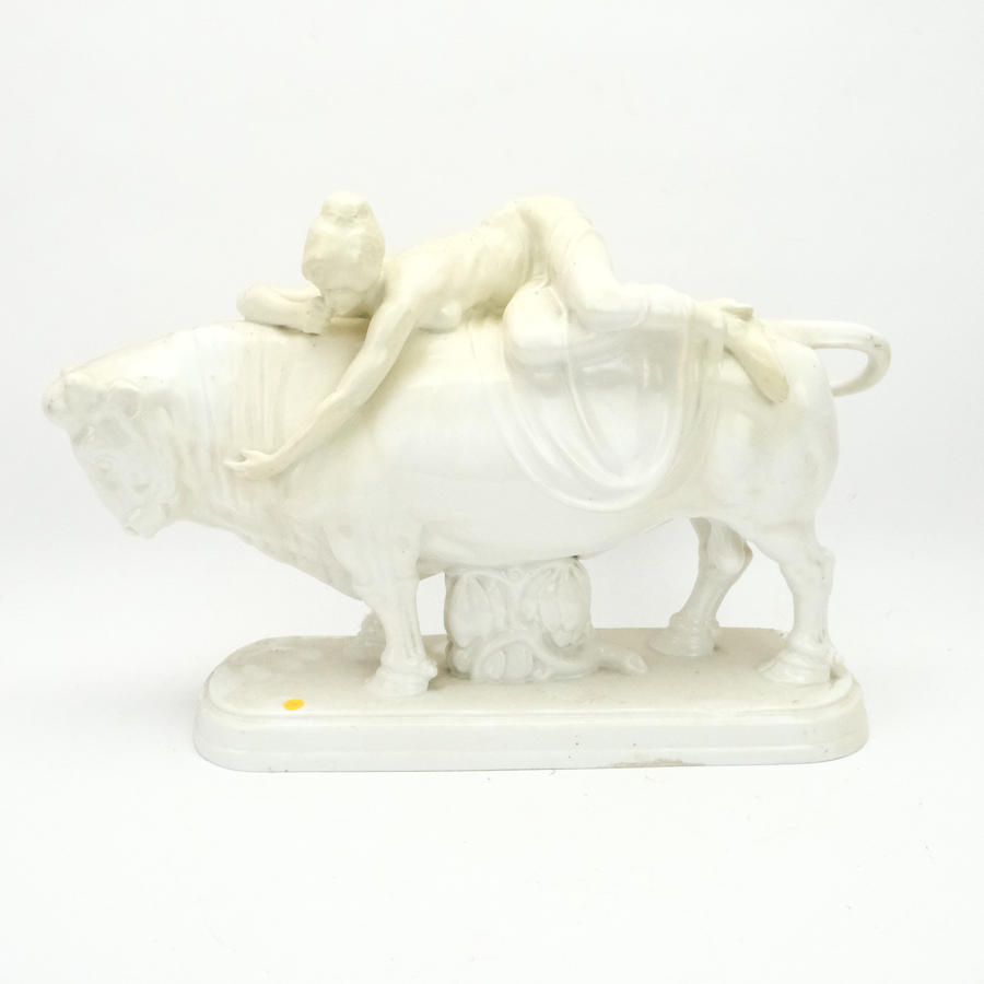 Een Duits wit porseleinen en geglazuurde sculptuur van "Europa op de stier". Gemerk aan de onderzijde Fraureuth Kunstabteilung. Gesigneerd Nacke (=Karl Nacke Geb. 1878). Ontwerp uit 1915.
