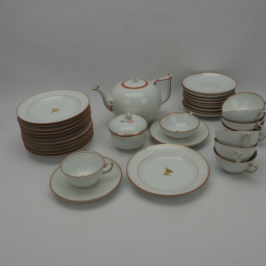 Een art deco wit porseleinen theeservies met gouden bloemmotief en rode bies, ontwerp Christoph Kaiser voor Meissen, ca. 1930 🡪 Nog naar kijken
