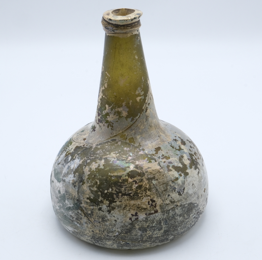 Een 18e eeuwse groen glazen fles met irriserende buitenkant, zgn. ‘kattekop’