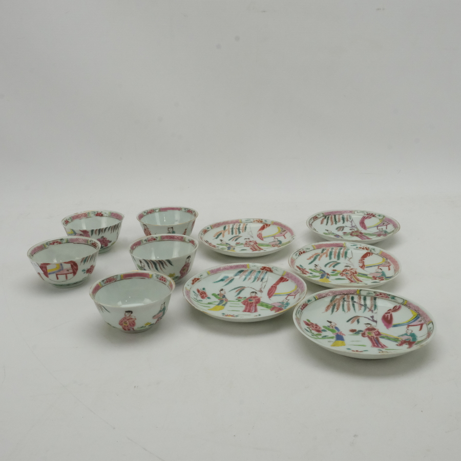 Een set van vijf 18e eeuws Chinees "egg shell" porseleinen kop en schotels, 3,5 cm hoog en schotels 11 cm doorsnede. Famille rose met een decor van muzikanten, lijs en een dansend zotje. Qianlon...