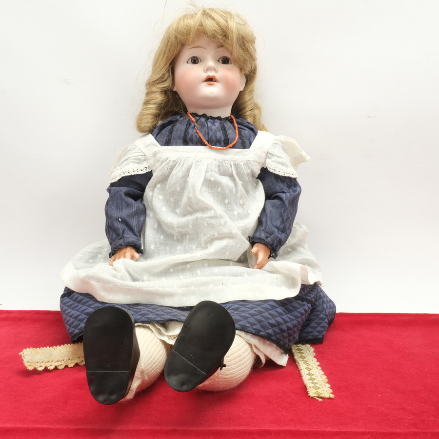 Een antieke Franse pop met papiermaché armen en benen. Een porseleinen hoofd. Gemerkt voor C. M. Bergmann, Walterhausen 1916, 61/2 uit ca 1916. Met blonde pruik. Gekleed en met een antiek bloedk...