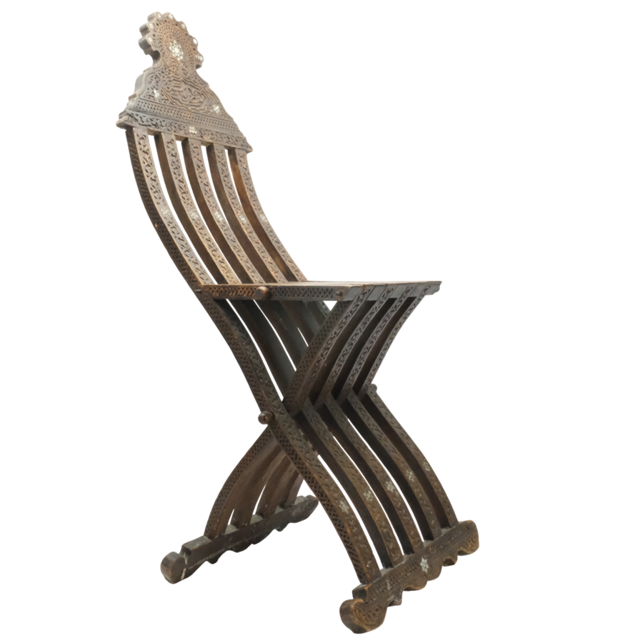 Een 19e eeuws Syrisch opvouwbaar stoeltje ingelegd met parelmoer.