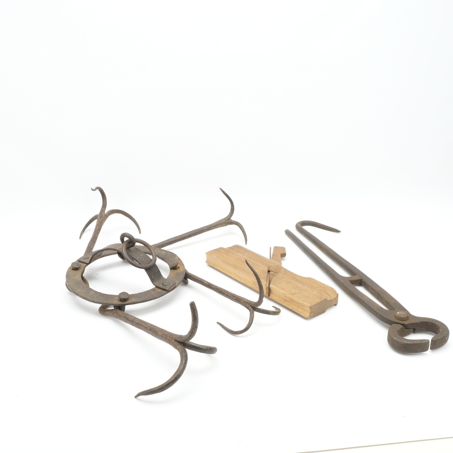 Lot van drie stuks antiek: een houten schaaf, smeedijzeren tang en een 18e eeuwse smeedijzeren wildkroon.