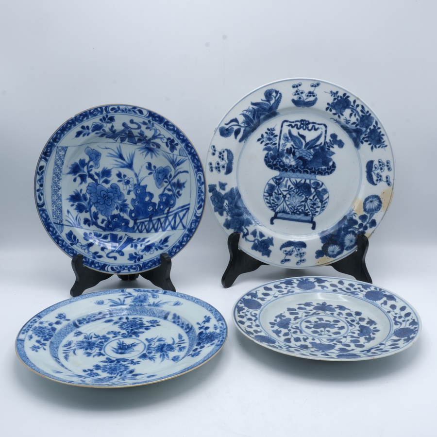 Vier Chinees 18e eeuwse Chinees porseleinen schotels. Blauw/wit met florale motieven en een bloemenmand op het plat. Qianlong en Kangxi periode.