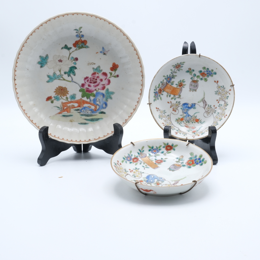 Een 18e eeuwse en twee 19e eeuwse Chinees porseleinen Famille Verte schotels, grootste met geschulpte rand. Polychroom decors van kostbaarheden en pioenrozen.