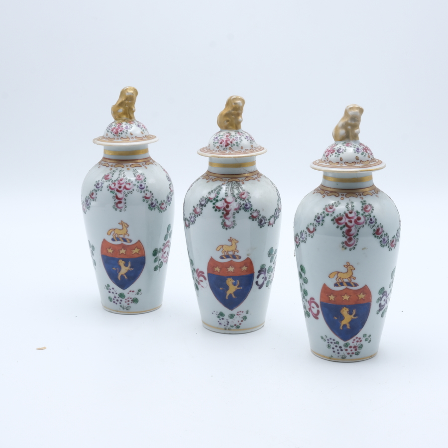 Drie Frans porseleinen dekselvaasjes, naar Chinese famille verte stijl. Voorzien van een wapen. Gemerkt voor Samson, Frankrijk.