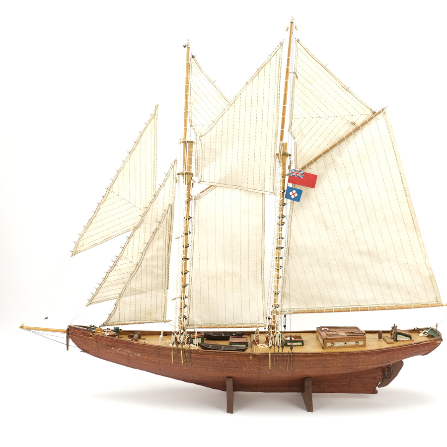 Een handgebouwd modelschip, voorstelling van een Bleunose, een Canadese vissersschoener uit het midden van de 20e eeuw