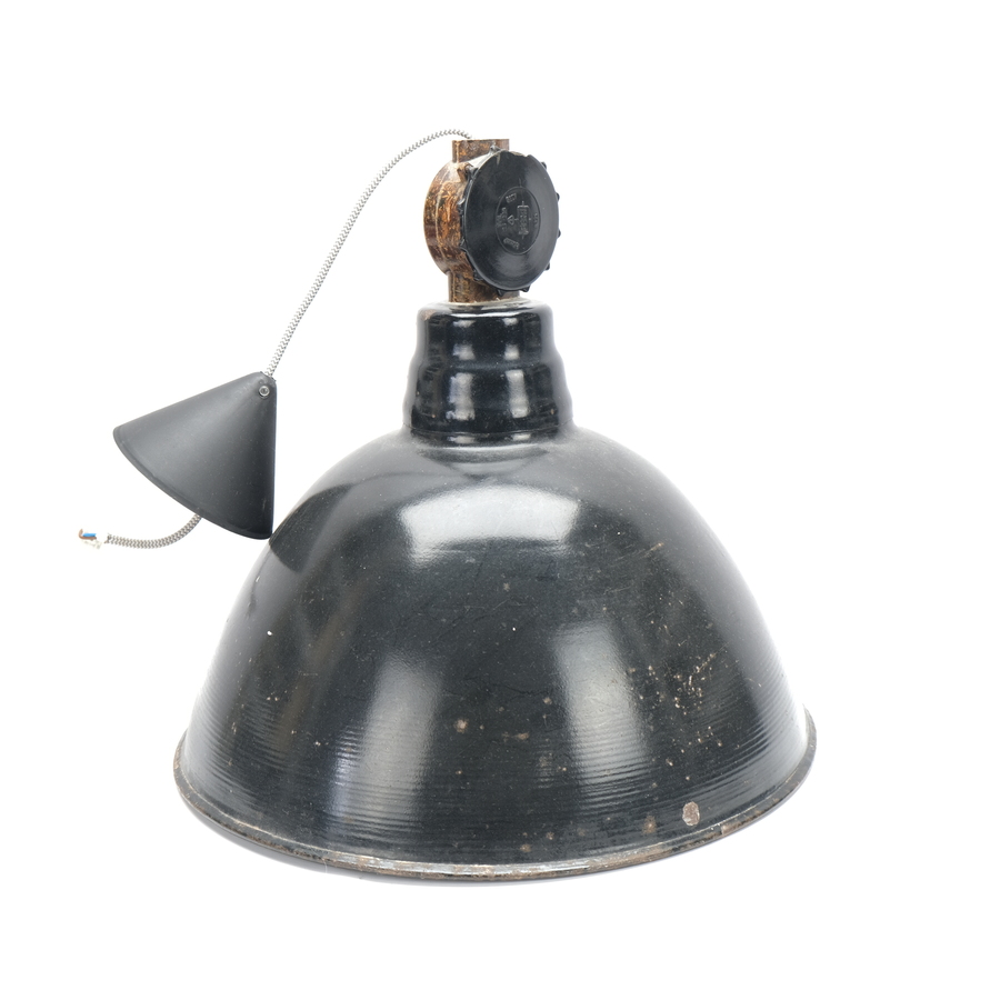 Een grote industriële jaren 50 metalen en geëmaileerde fabriekslamp. Met een bakelieten fitting. Afkomstig uit Duitsland.