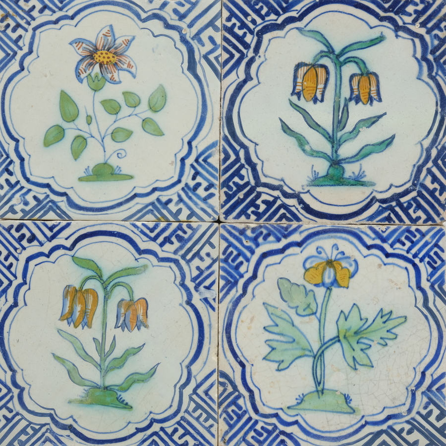 Vier antieke 17e eeuwse tegels, polychome bloemen in blauw Wanli-stijl medaillon.