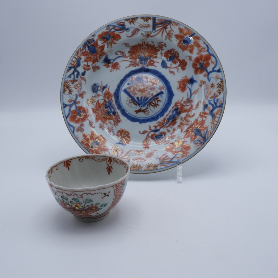Lot van twee stuks Chinees: een vroeg 18e eeuws Chinees porseleinen Kangxi bord met imari decor, florale motieven en op de (verhoogde) ziel decor van huisje in een waaier. Met daarbij een 18e ee...