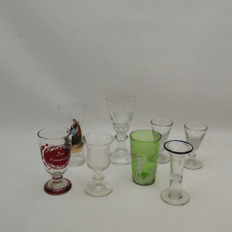 \Lot diverse sierglazen, waaronder een gegraveerde kristallen bokaal, Richard Süßmuth, met spreuk 'Ich Lechze nach erfrisahung' en familiewapen, een Mary Gregory glas, een glas met Scheveningse ...