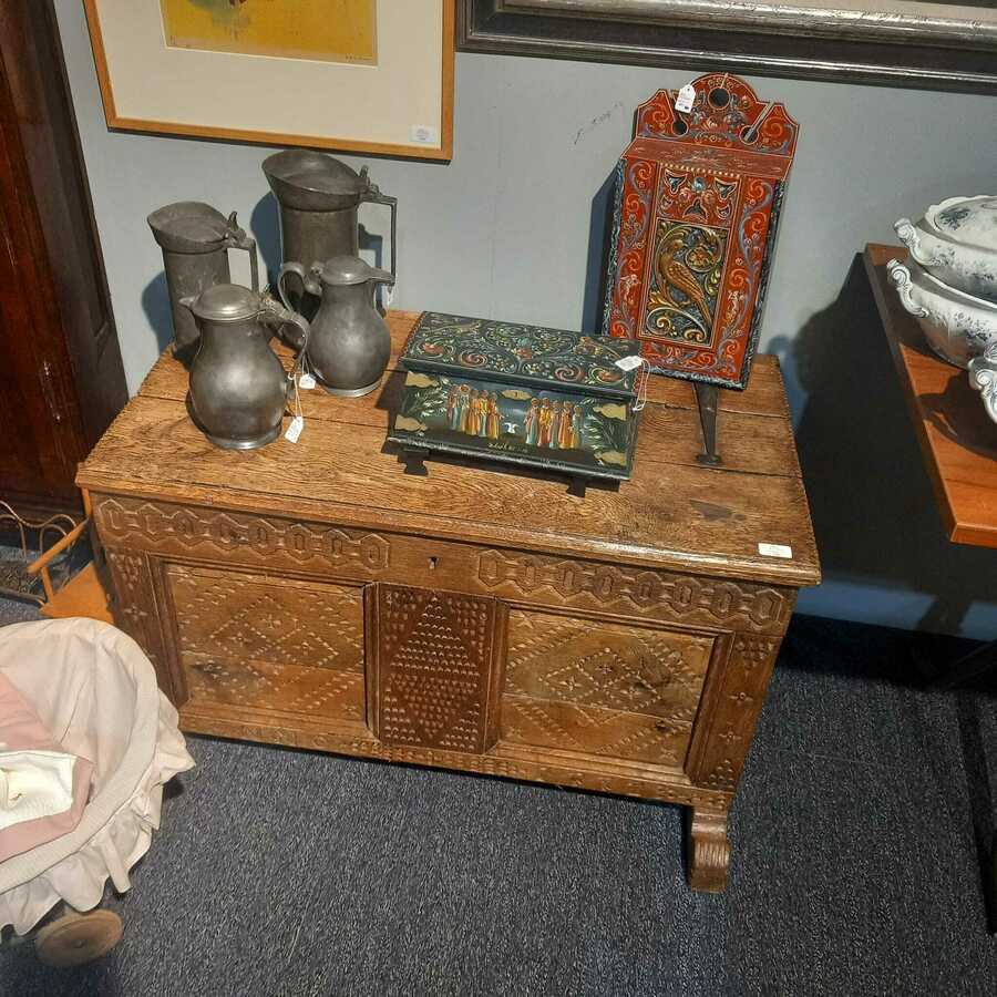 Een antieke 18e eeuwse dekenkist met smeedijzeren scharnieren op de deksel. De voorkant gestoken decor en tekst 'anno 1772'