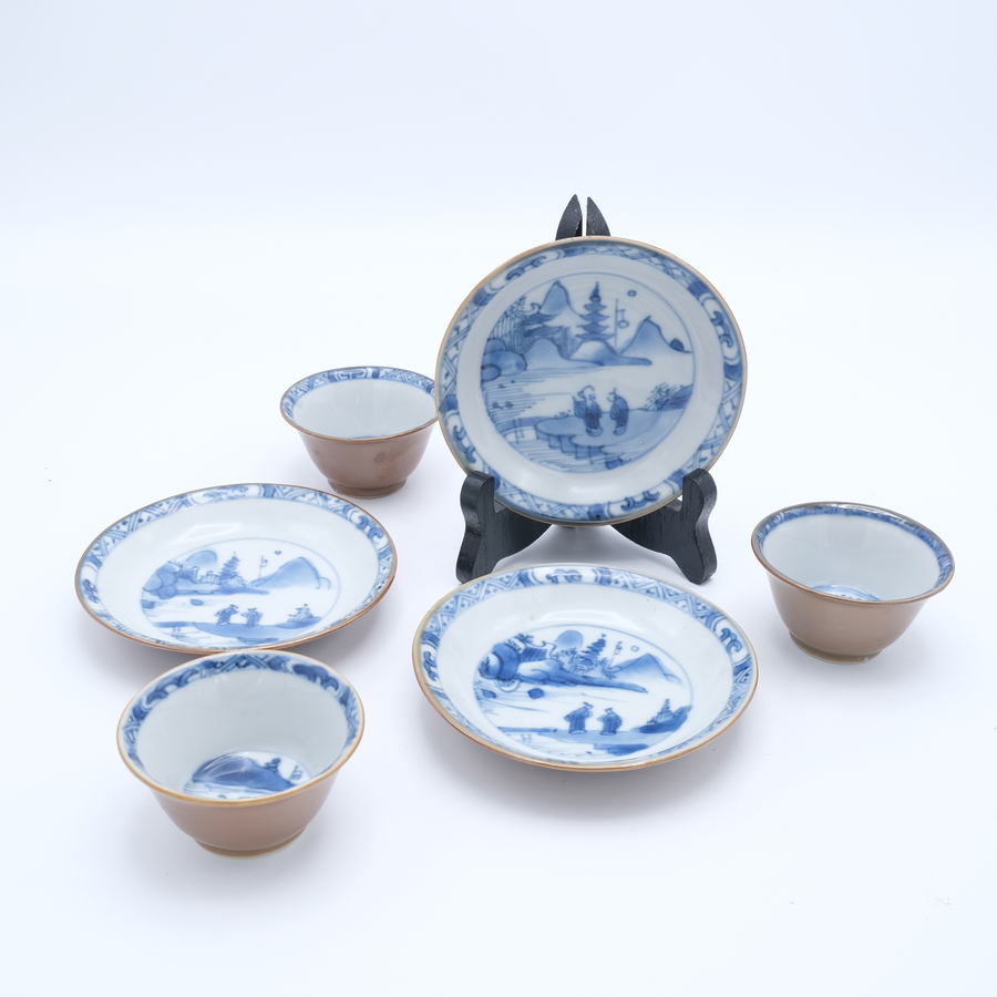 Lot van drie 18e eeuwse Chinees porseleinen kop en schotels, capucijner met onderglazuur blauw-wit beschildering van figuren in een landschap