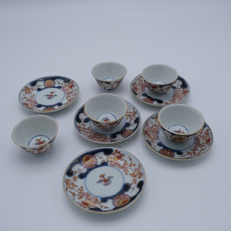 Vijf 18e eeuwse Japans imari kop en schotels.
