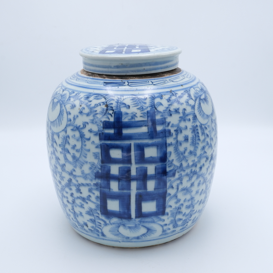 Een antieke 19e eeuwse Chinees porseleinen gemberpot met floraal blauw-wit decor en 'longevity' teken op deksel en pot
