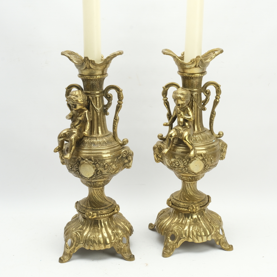 Lot van twee 19e/20e eeuwse Franse bronzen kandelaars, met twee oren, ramskoppen en zittende putti's.