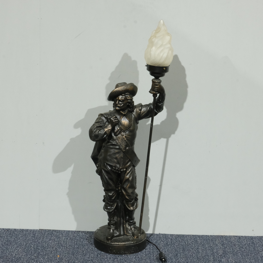 Een 20e eeuwse kunststof gegoten lamp, voorstelling van een soldaat met in zijn hand een lamp. Gemerkt Cavalier