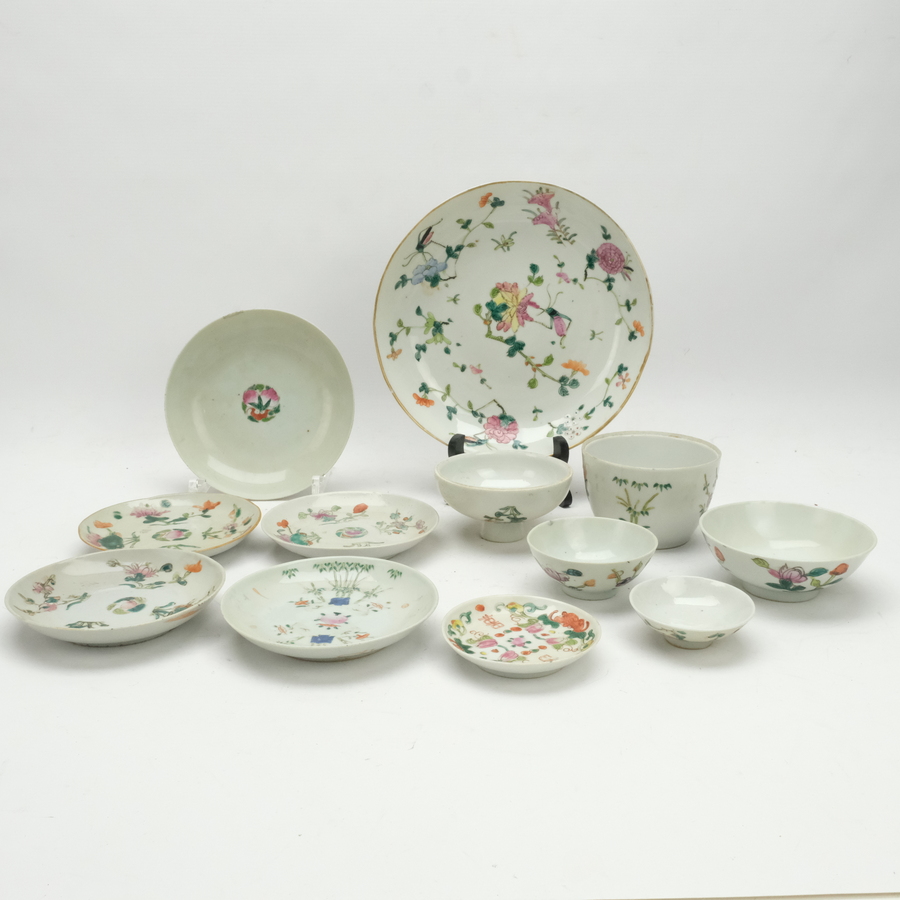 Lot van tien stukken Chinees porselein. Polychroom met diverse decors van bloemen en insecten. Laat 19e en vroeg 20e eeuws.