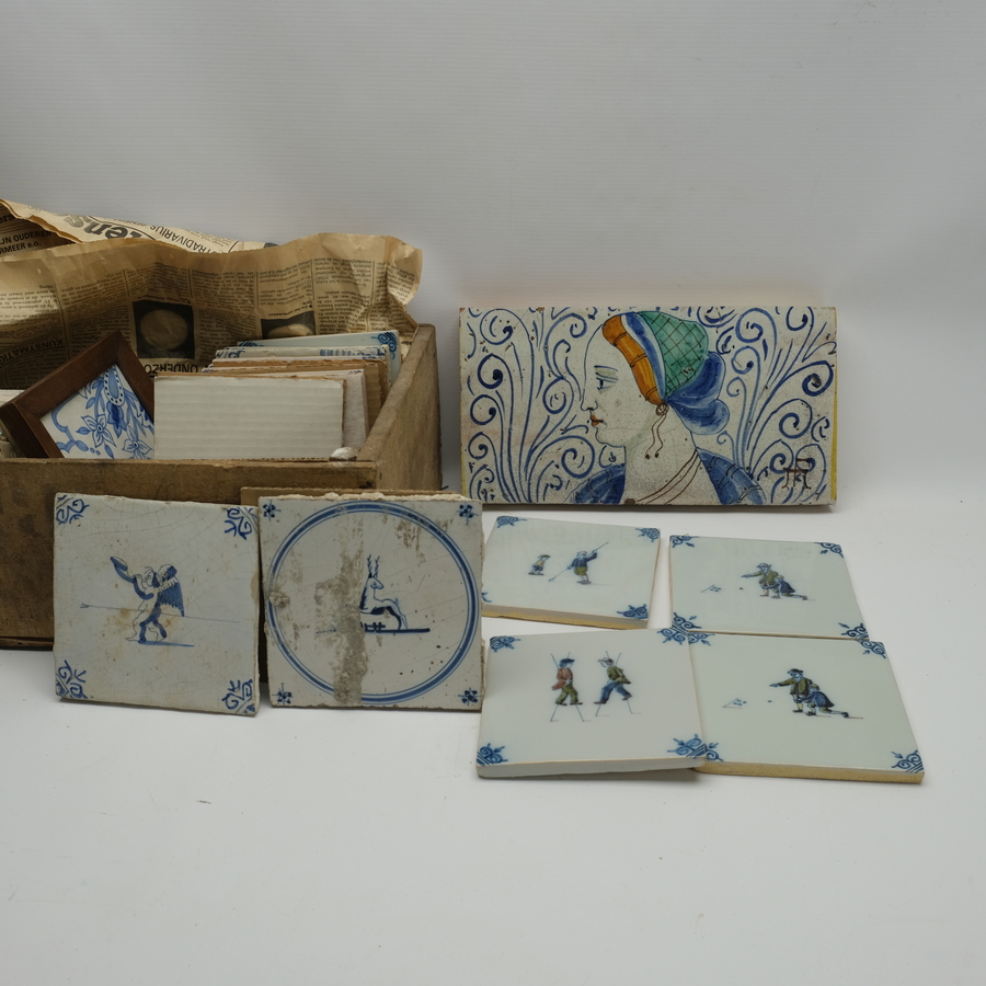 Een lot met diverse Hollandse tegels. Blauw/wit met diverse decoraties, waaronder een 18e eeuwse met een decor van een engel met hoorn.