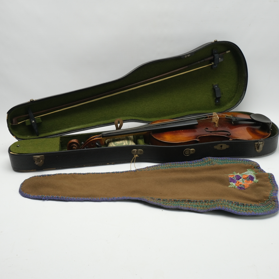 Een houten viool met papieren label. Met Strijkstok en in originele koffer.