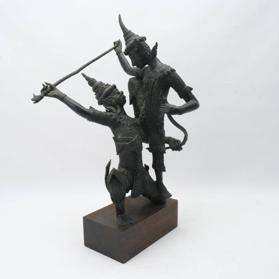 Een groot Indonesisch bronzen beeld, voorstelling van twee vechtende krijgers met lotusbloem in de hand, op houten sokkel. 52 cm hoog